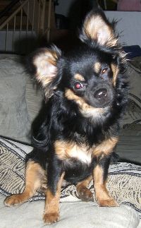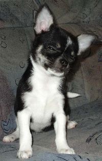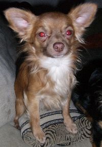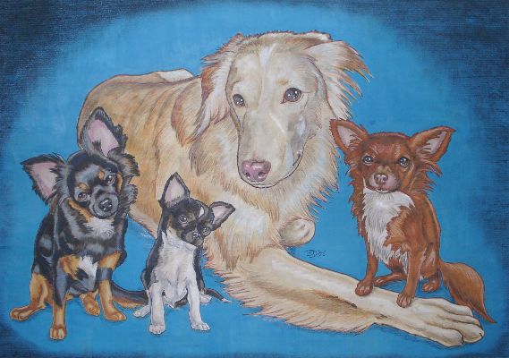 Auftragsarbeit "Fibi". Eine Chihuahua-Hündin, gemalt nach diesem Photo. Der Hintergrund dieses Bildes ist golden und damit schlecht auf dem Bildschirm wiederzugeben.