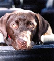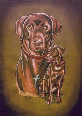 Luna, eine braune Labrador-Hündin. Gemalt nach diesen beiden Photos. Der Hintergrund ist in einem gold-metallic Farbton abgemischt, den man am PC leider nicht wiedegeben kann.