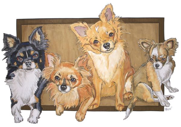 Hier sieht man die Chihuahuas Snoopy, Gismo, Balou und Yoyo. Gemalt nach Vorlage dieser Photos.