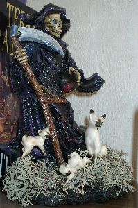 - komplett neu bemalt (Relieftechnik; dadurch bessere plastische Wirkung) - - Augenhöhlen ausgefüllt ("Seine Augen glühten wie kleine Supernoven") - - Boden mit Wildmoos verziert (gesammelt im Schwarzwald) - - Katzen hinzugefügt (vorher nicht vorhanden) -